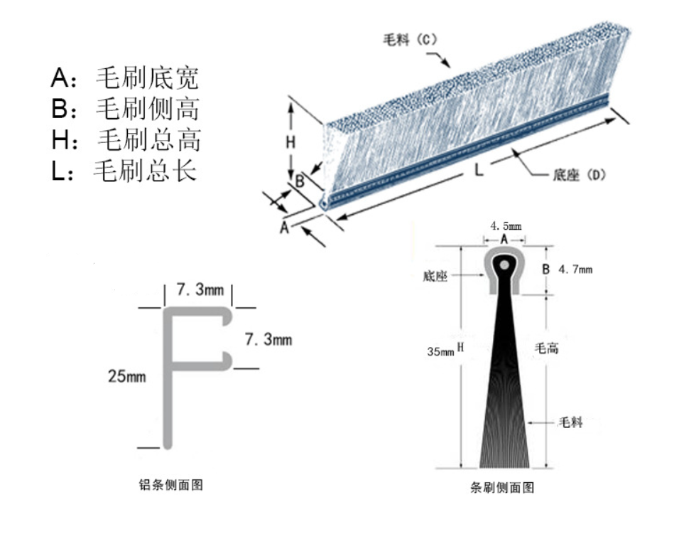 工業(yè)門、卷簾門、快速門一般使用H型(180°)或者F型(90°)鋁條配套毛刷,毛刷的高度常用規(guī)格是35mm,50mm,100mm,毛料有PP,PA。